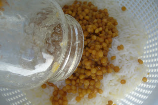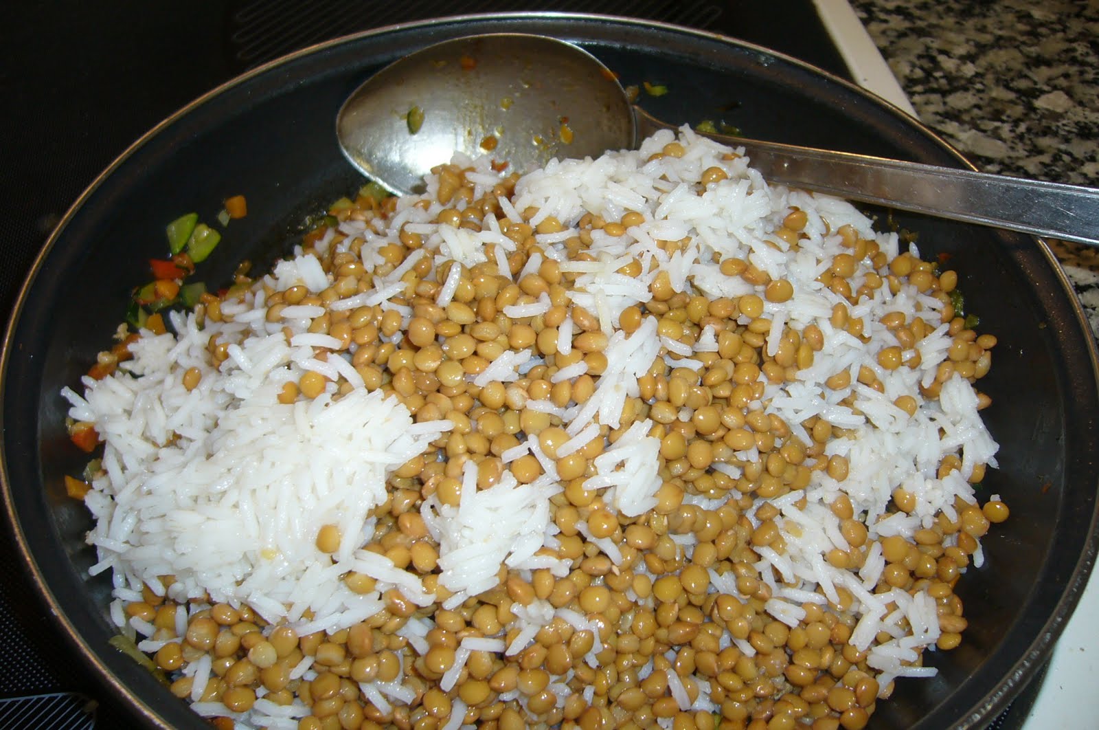 Escurres el arrocito y de paso echas las lentejas del bote y les das un lavado con el arroz, porque el agua ese que llevan dentro del bote es sospechosamente espumosa y espesa así que mejor se la quito bien.